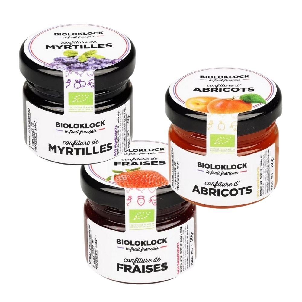3x Prémiové francúzske džemíky BIO, až 60% ovocia pestovaného v ekologickom poľnohospodárstve. Čučoriedka, marhuľa a jahoda v mini pohároch 30g sú ideálne na raňajky ku koláču alebo croissantu, alebo do jogurtu.