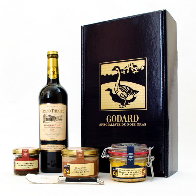 Veľká darčeková krabica jedného z prestížnych výrobcov kačacích a husacích pečienok Foie Gras je ideálna na darčekový balík s jednou fľašou vína a dvoma až troma produktami z francúzskych delikates, prioritne samozrejme výrobkov firmy Godard, ktoré nájdete v našej ponuke.