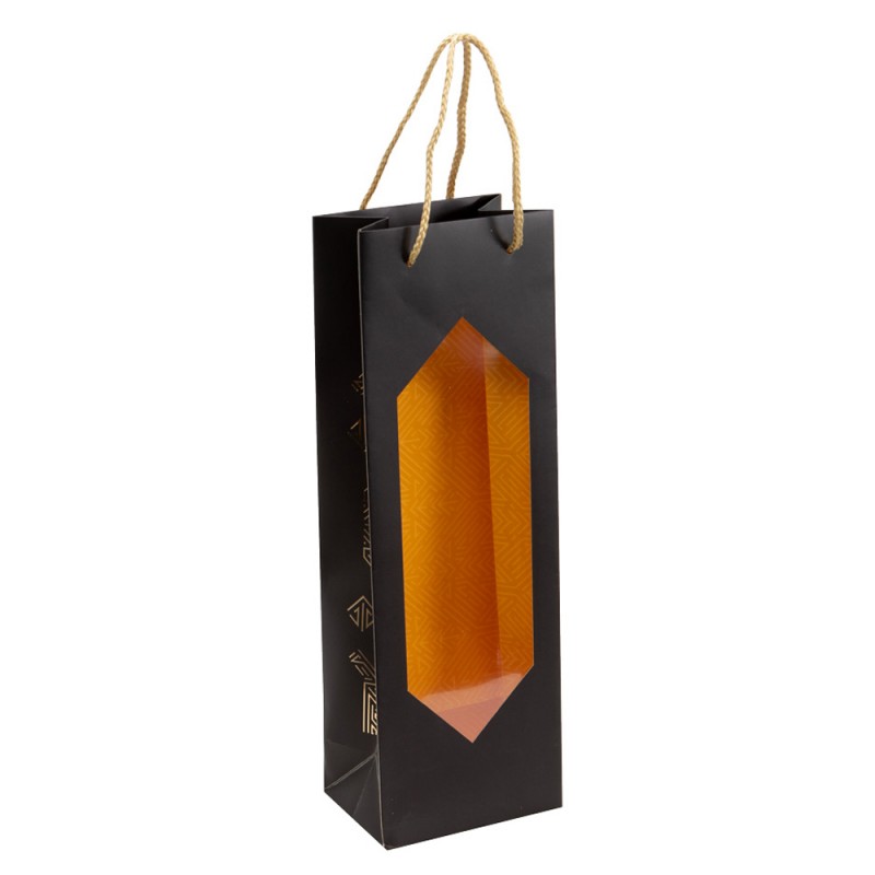 Elegantná kartónová taška s okienkom v kombinácii čiernej, zlatej a oranžovej je ideálna na zabalenie jednej fľaše alebo rôznych delikates, či iných vianočných darčekov. Je navrhnutá pre jednoduché balenie, jej priehľadné PVC okienko umožňuje nahliadnuť do obsahu.
