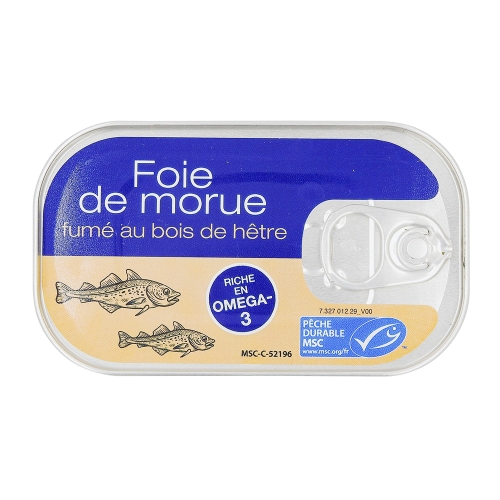 Tresčia pečeň z voľne žijúcej tresky, údená na bukovom dreve, Francúzsko, plech 121g, T002475, EAN 3580288088008