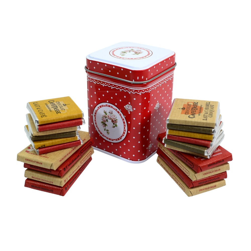 Darčeková plechová krabička Elegant Red 60x60x85 mm plná prémiových belgických čokoládiek Café Tasse.