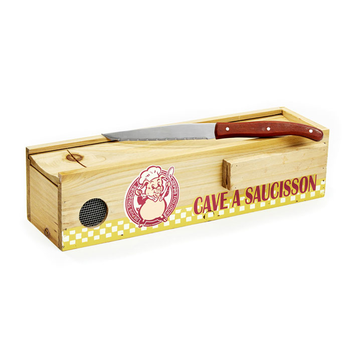 Drevená štýlová krabička na klobásky, salámy alebo tvrdé syry, spolu s nožíkom "L'andouille ". V chladničke udrží produkty dlhšie čerstvé, znižuje riziko vzniku plesní na uložených potravinách. Vrchná časť je výsuvná, slúži na vkladanie produktu a na bočnej strane je vetrací prieduch a miesto na odkladanie nožíka. Súčasťou balenia je aj zúbkovaný nožík s drevenou rúčkou. Kvalita zaručená francúzskym výrobcom Natives France.