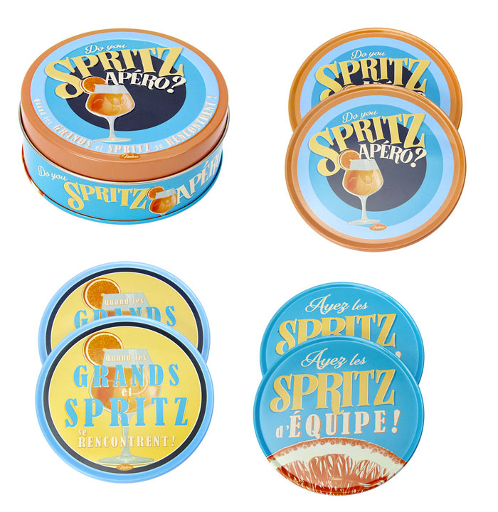 - Podšálky okrúhle sada 6 ks v dóze "Spritz" 9,5 x H 3,5 cm, plech + korok