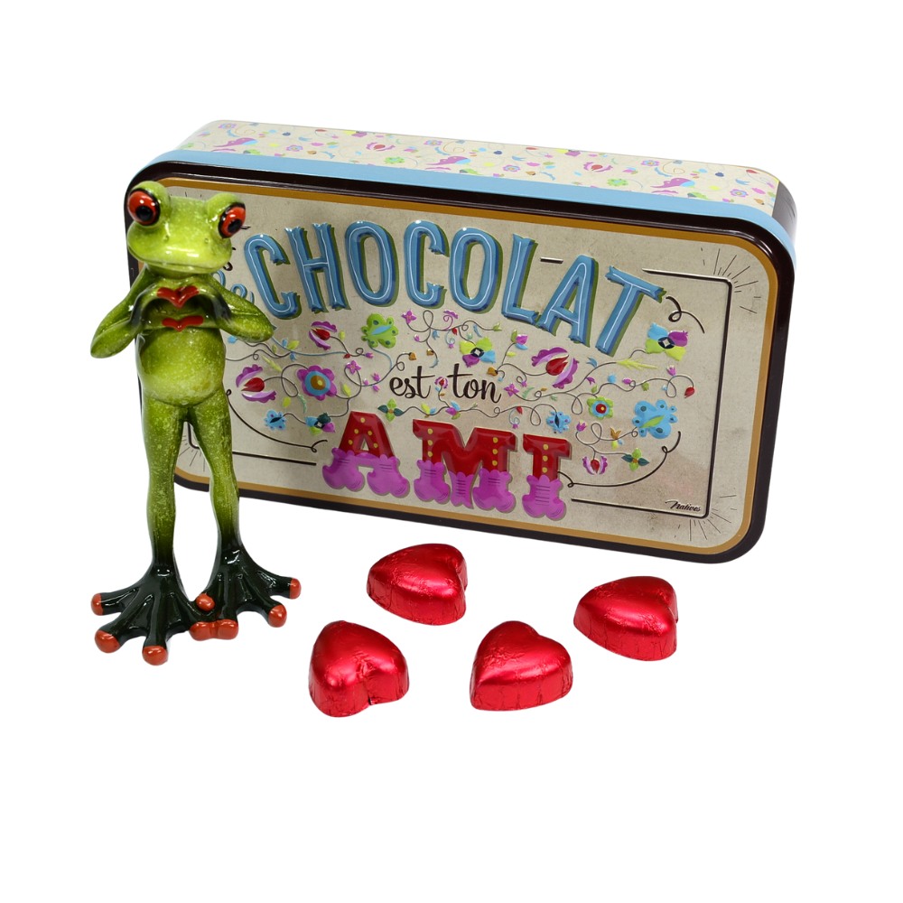 Krásna francúzska dóza Natives na skladovanie sušienok alebo cukroviniek so žabiakom darujúcim svoje srdce a čokoládkami Café Tasse.
